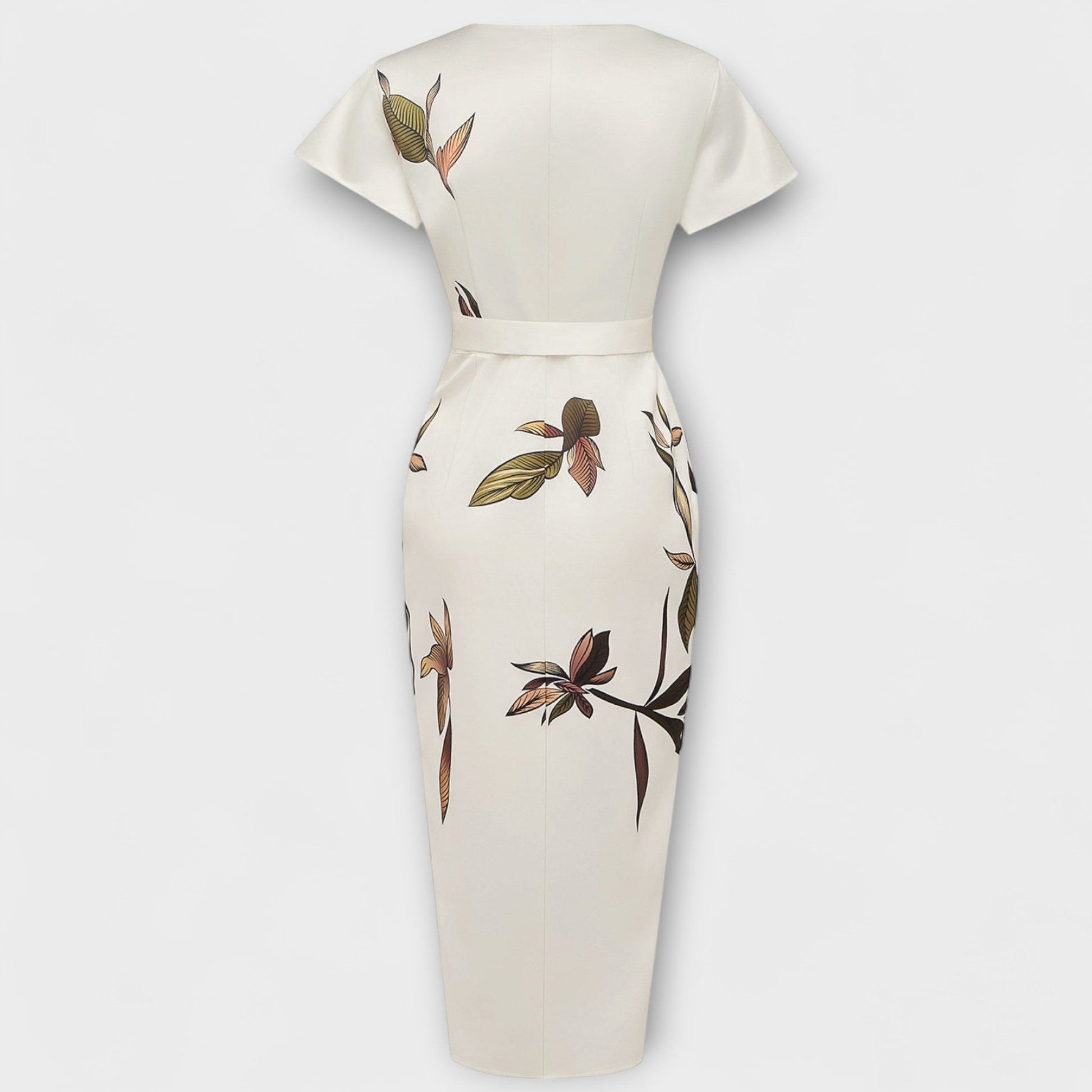 Incantevole abito midi avvolgente con vivace stampa a foglie e scollatura a V che valorizza la figura. Ideale per ogni occasione, da brunch a eventi all'aperto.
