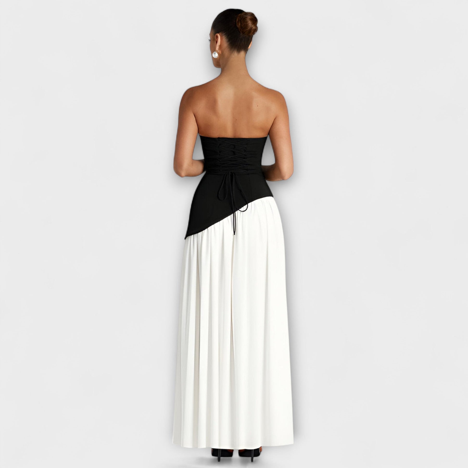 - Design a contrasto: Il sorprendente top nero senza spalline abbinato a una gonna bianca fluida crea un look di alta moda.